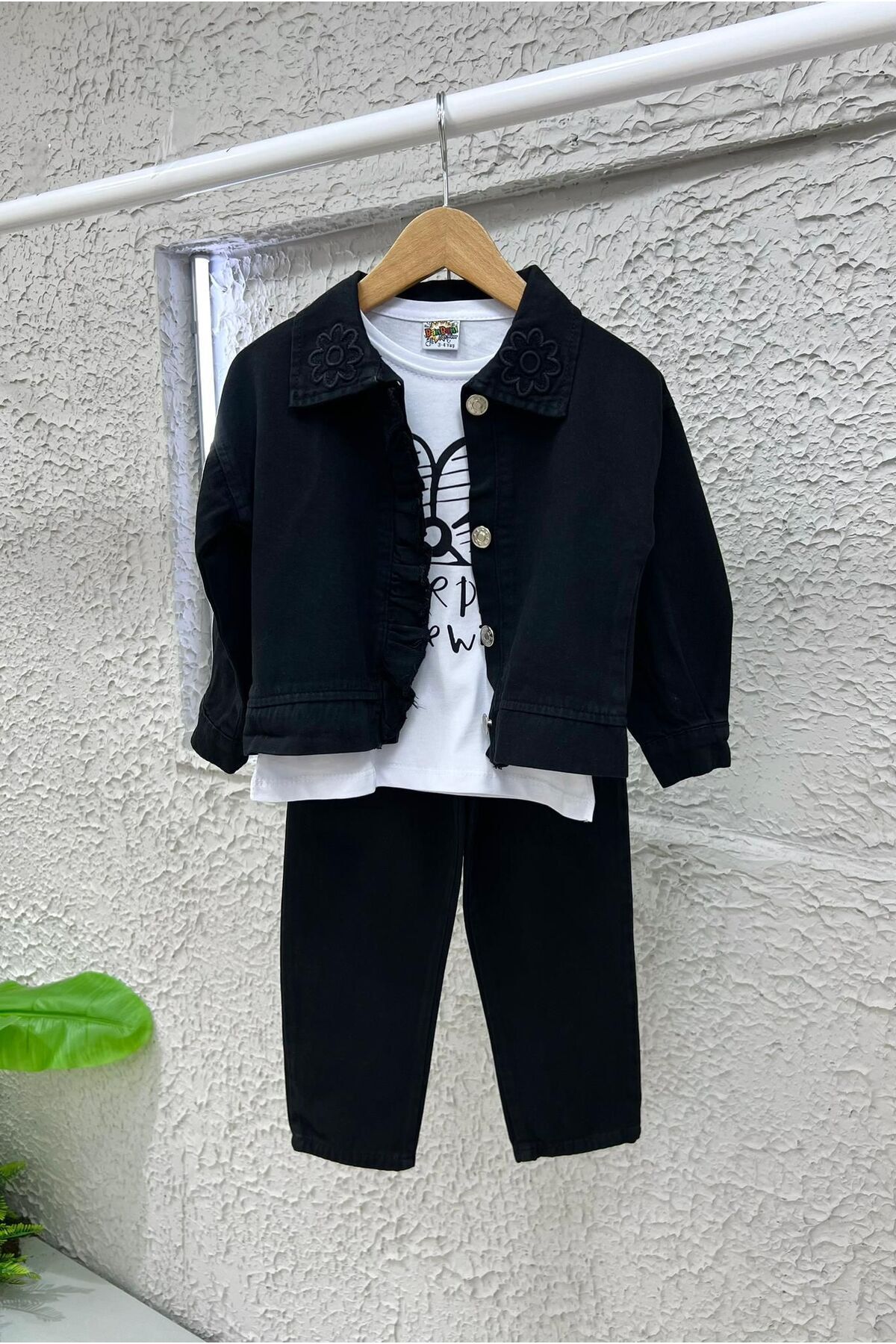 kız çocuk takım nakis detaylı 3 lü takım kombin spor şık gabardin Siyah - 7-8 Yaş