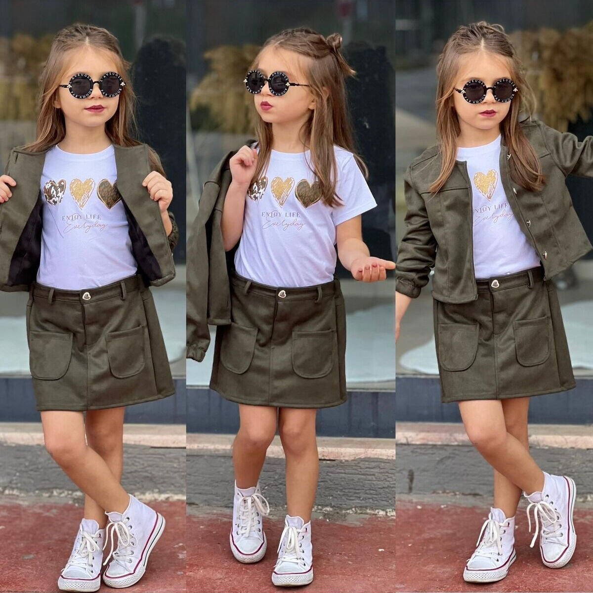 ceket, etek ve hırka olmak üzere tam bir görünüm oluşturur.