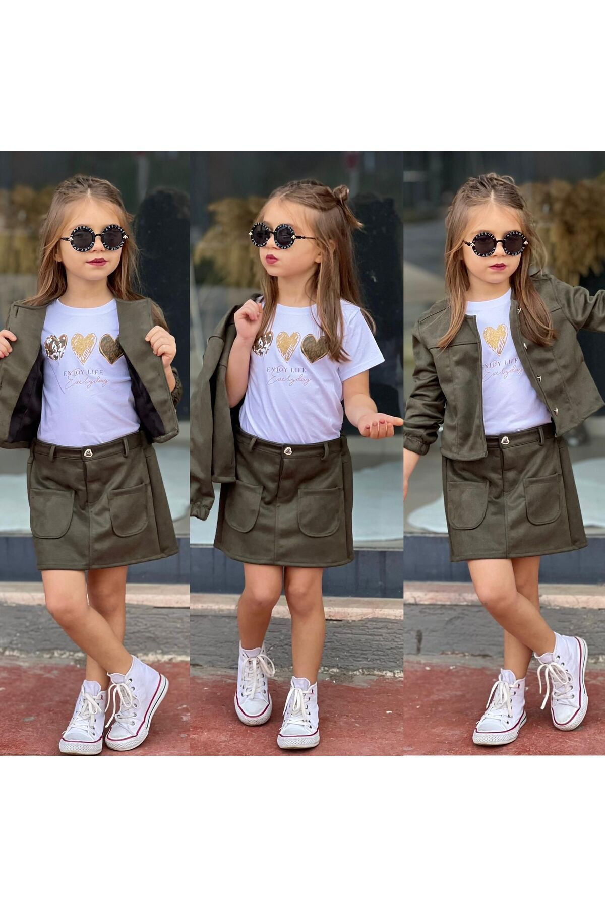 ceket, etek ve hırka olmak üzere tam bir görünüm oluşturur.
