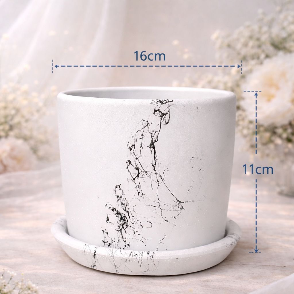 Modern ve zarif tasarımıyla yaşam alanlarınıza şıklık katacak mermer desenli dekoratif saksı modeli. Minimal beyaz zemin üzerine uygulanan özel mermer efekt detayı sayesinde hem klasik hem modern dekorasyon tarzlarına mükemmel uyum sağlar.