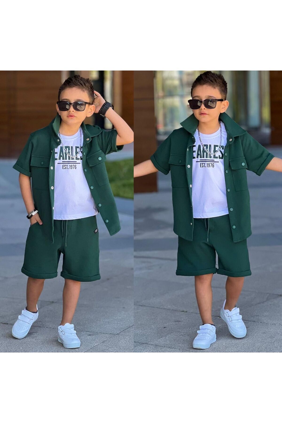 Siyah Cep Kapaklı Gömlek Günlük 3 Lü Takım Spor Bayramlık Erkek Çocuk Takım Yeşil - 5-6 Yaş