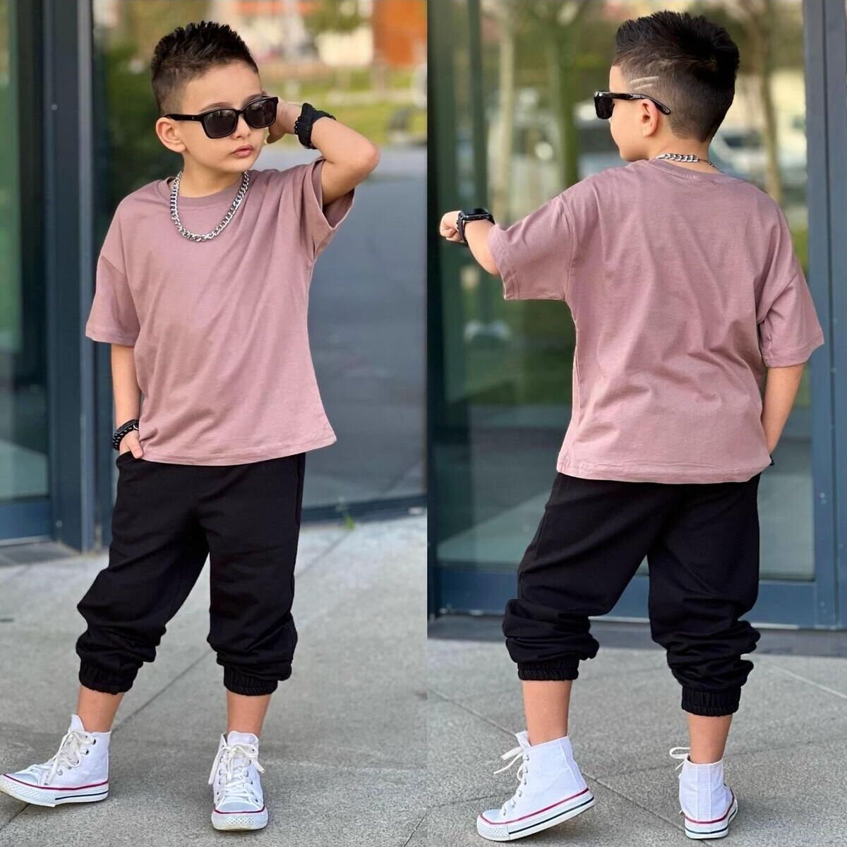 - T-shirt-pantolon ikilisi olarak tasarlanmış bu takım, günlük giyimde şıklığı ve rahatlığı bir arada sunar.