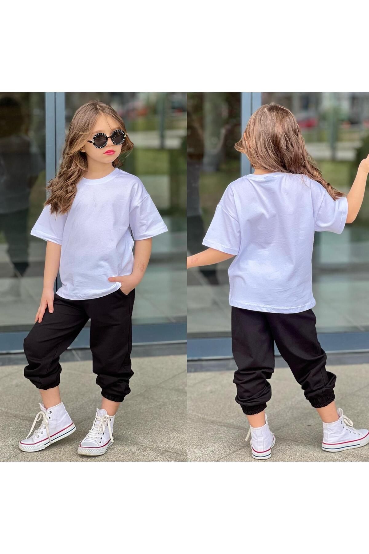 tişort eşofman alt üst 2 li baskısız kız çocuk takım beyaz-siyah - 11-12 Yaş