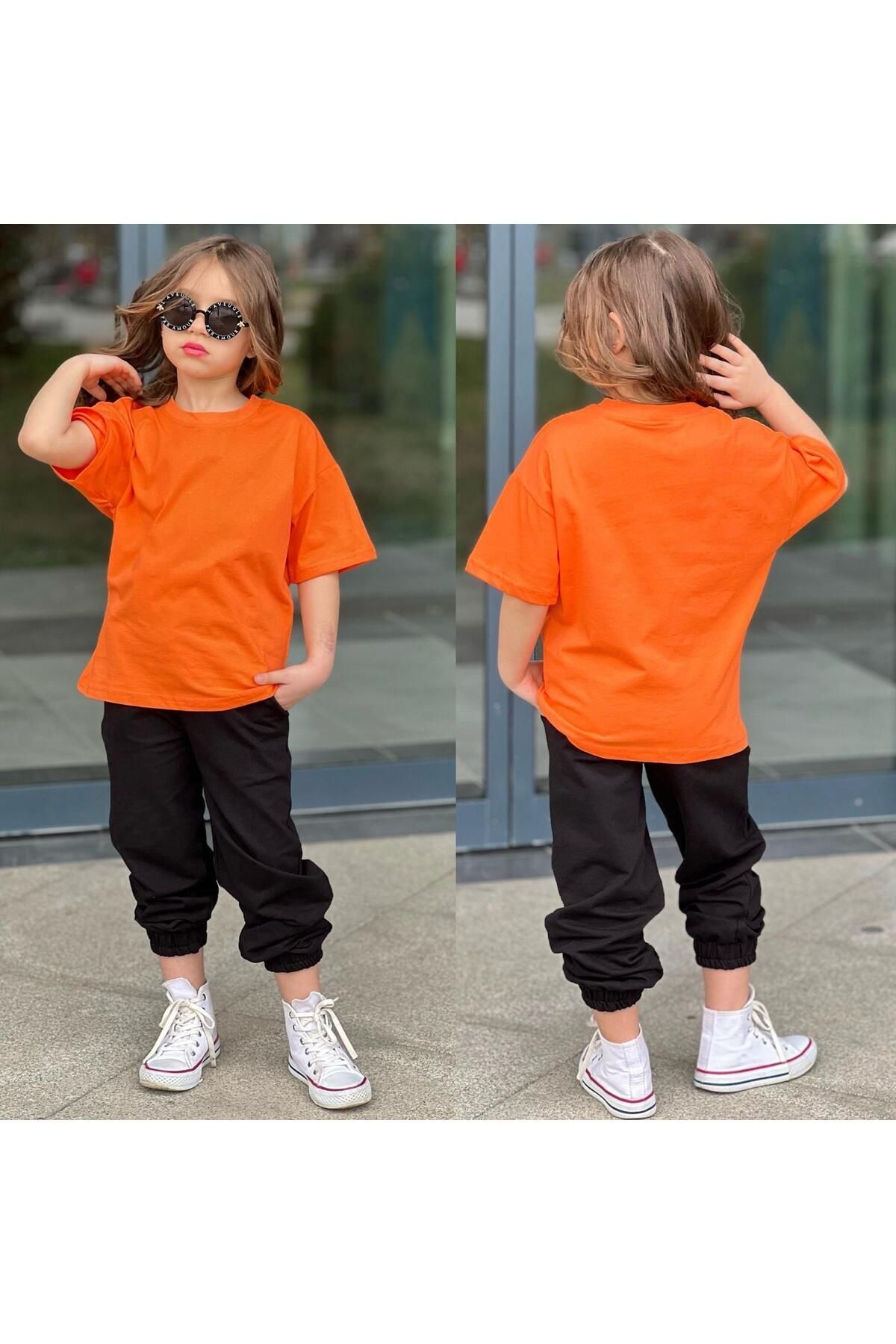 tişort eşofman alt üst 2 li baskısız kız çocuk takım turuncu_siyah - 3-4 Yaş