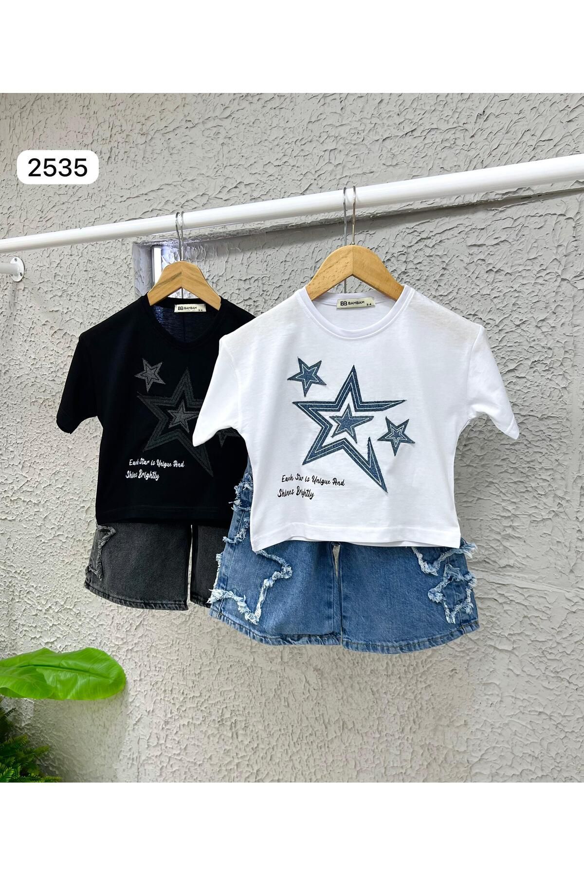- Yıldız nakışı detaylarıyla süslenmiş, çocukların enerjisini yansıtan bu kot şort takımı, yaz aylarının vazgeçilmezi olacak.